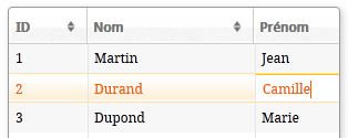 Cliquez sur le bouton Run projet dans la barre d’outils de Wakanda Enterprise Studio : Cette action démarre Wakanda Enterprise Server et publie l’application "EmpWakanda". Grâce à la liaison 4D Mobile mise en place, les données de la base 4D s’affichent alors dans une fenêtre de votre navigateur par défaut : Vous pouvez tester les propriétés dynamiques de la liaison en modifiant les données côté Web. Ici par exemple, le prénom "Pierre" est changé en "Camille", 4D reflète immédiatement la modification :