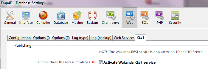 A base de dados 4D já está pronta para responder as solicitações 4D Mobile de Wakanda. Tenha em conta que para simplificar este exemplo, não vamos controlar acessos 4D Mobile. No entanto, em um contexto de produção ou de arquitetura aberta, é indispensável para garantir os acessos 4D Mobile via REST (ver a seção Sobre a segurança da aplicação 4D Mobile).