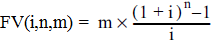 Para calcular o valor adquirido durante um investimento com vários depósitos, se os pagamentos mensais são pagos ao final do período, passe o parâmetro m e omita o parâmetro f. Aqui está a fórmula para este cálculo: