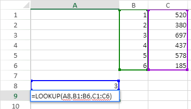 "3", ubicado en la celda A8, es el valor que se debe buscar. B1: B6 es el intervalo de búsqueda. C1: C6 es el intervalo de retorno. La celda B3 contiene el valor a encontrar. El valor correspondiente en el intervalo de retorno está en la celda C3, es decir, "697".