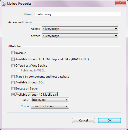 2. Set the 4D Mobile call properties for the method and click on OK: