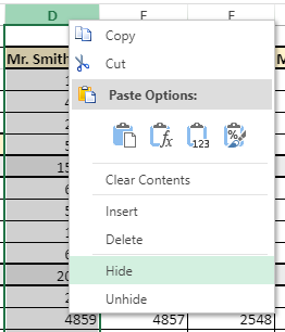 - clic dans un en-tête de colonne ou de ligne : Insert, Delete, Hide ou Unhide,