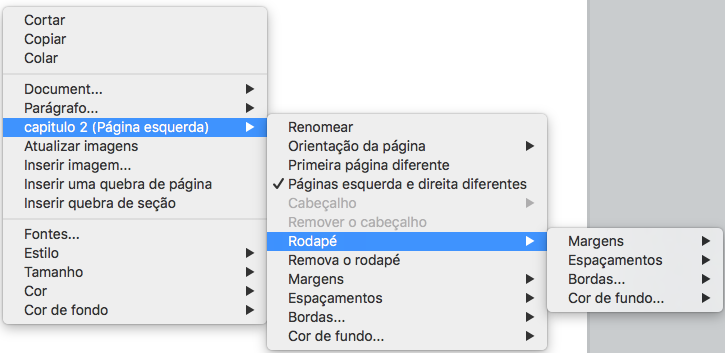 Note que se tiver definido uma primeira página diferente ou a opção de páginas da esquerda e da direita diferentes para a seção, o tipo de página também é exibido no menu (ver abaixo)