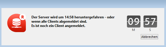 Gleichzeitig erhalten alle Arbeitsstationen eine entsprechende Meldung. Der Benutzer kann die noch verbleibende Zeit weiterarbeiten. Dieses Dialogfenster wird alle 20 Sekunden wiederholt, um die Arbeitsstationen zum Beenden aufzufordern. Ist die Zeit abgelaufen, beendet der Server, auch wenn noch Client-Rechner angemeldet sind.