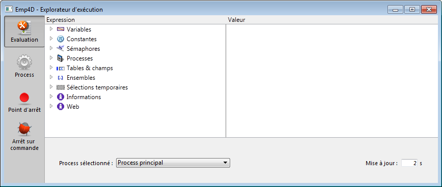 La fenêtre se compose de quatre pages, accessibles via des boutons situés dans la partie gauche : Evaluation, Process, Points d’arrêt et Arrêt sur commande.