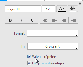 Dans certains cas, vous pourrez vouloir répéter les valeurs des colonnes de rupture pour qu’elles apparaissent avec chaque enregistrement de la zone de rupture. Pour cela, il suffit d’affecter la propriété Valeurs répétées à la colonne. Cette propriété est définie dans la fenêtre contextuelle associée l'en-tête de la colonne :