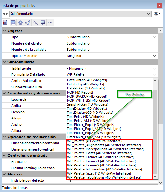 Por defecto, el subformulario Widget 4D Write Pro ofrece un conjunto completo de paneles de control. El panel de control por defecto es el formulario detallado "WP_Palette". Sin embargo, también puede utilizar estos paneles de control individualmente seleccionando el formulario detallado correspondiente en la Lista de propiedades del editor de formularios: