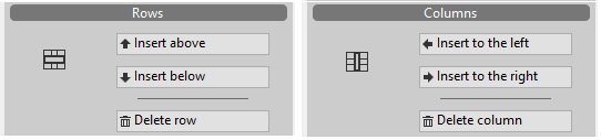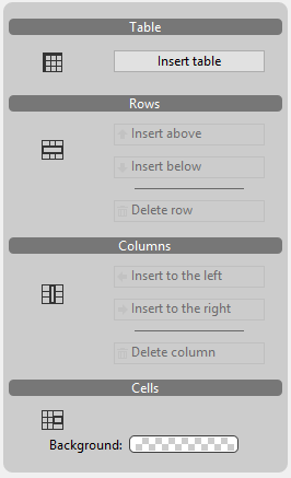 Este panel gestiona tablas en el área 4D Write Pro. Puede insertar una tabla, agregar y eliminar filas y columnas, y definir el color de fondo de las celdas individuales.