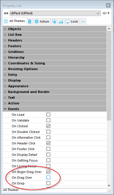 • List box: propiedad "Arrastrable" y el evento "On Begin Drag Over" marcados