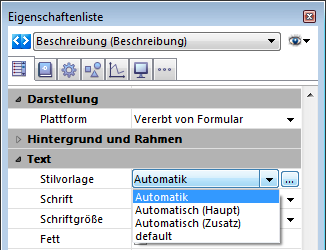 Hinweis: Diese Stilvorlagen sind nur in der Eigenschaftenliste verfügbar. Sie erscheinen nicht in der Liste der Stilvorlagen in der Toolbox.