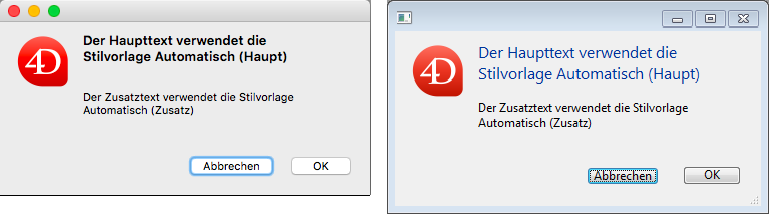 Diese Stilvorlagen dienen hauptsächlich zum Gestalten von Dialogboxen. Damit können Sie unterschiedliche Schriftstile für Haupttext und zusätzliche Information in den Fenstern Ihrer Oberfläche verwenden. Hier sehen Sie zwei typische Dialogfenster mit automatischem Haupt- und Zusatztext: