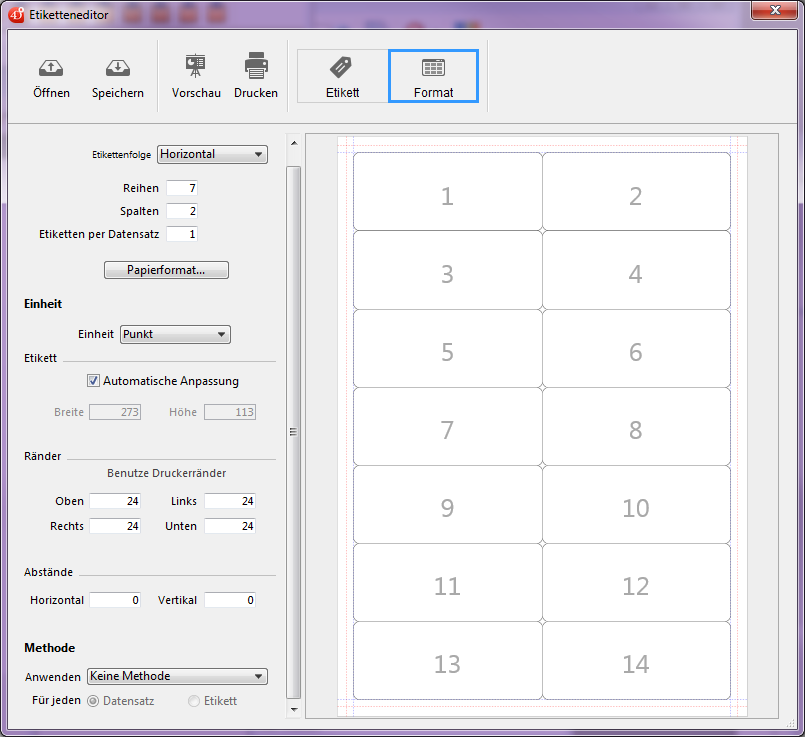 Die Seite Format enthält Optionen zum Drucken von Etiketten gemäß den Einstellungen des Druckers, den Sie im Druckmanager (Auswahl auf Macintosh) ausgewählt haben, so dass die Seite richtig formatiert wird.