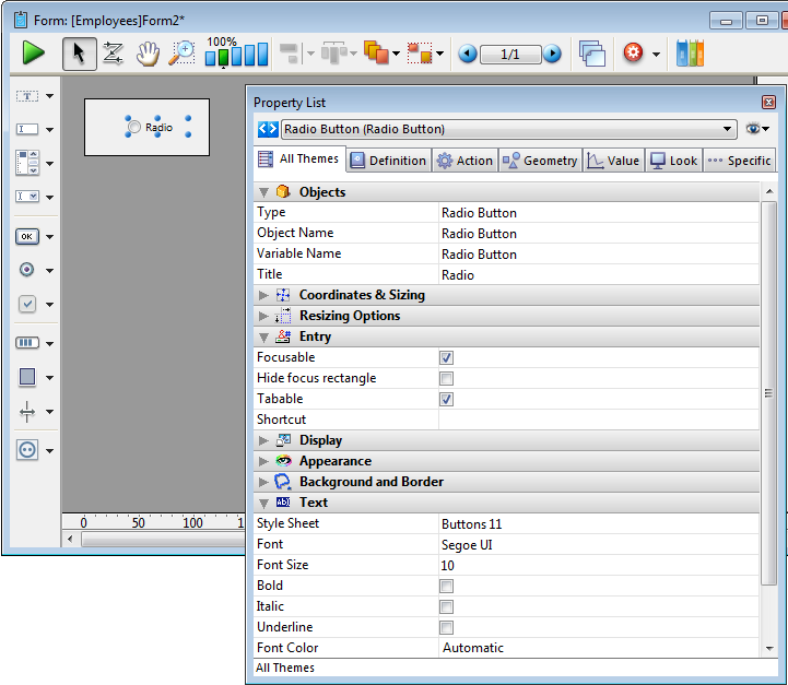 フォーム内でラジオボタンを利用するにあたっての詳細は ラジオボタンとピクチャーラジオボタン を参照ください。