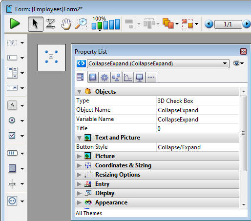 フォーマット済みの折りたたみ-展開 3D ボタンを追加します。プロパティリストにて、プロパティを変更できます。