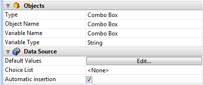 A opção Inserção automática se encontra no tema "Fonte de dados" da Lista de propriedades para os objetos de tipo combo box: