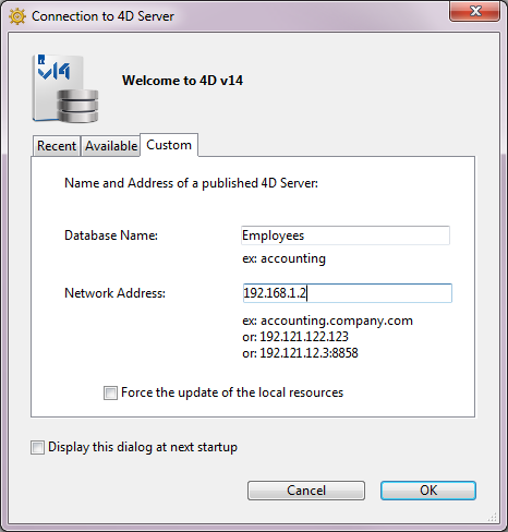 Nota: Você também pode iniciar essa caixa de diálogo ao selecionar o link Conectar ao 4D Server no Assistente de Boas Vindas..