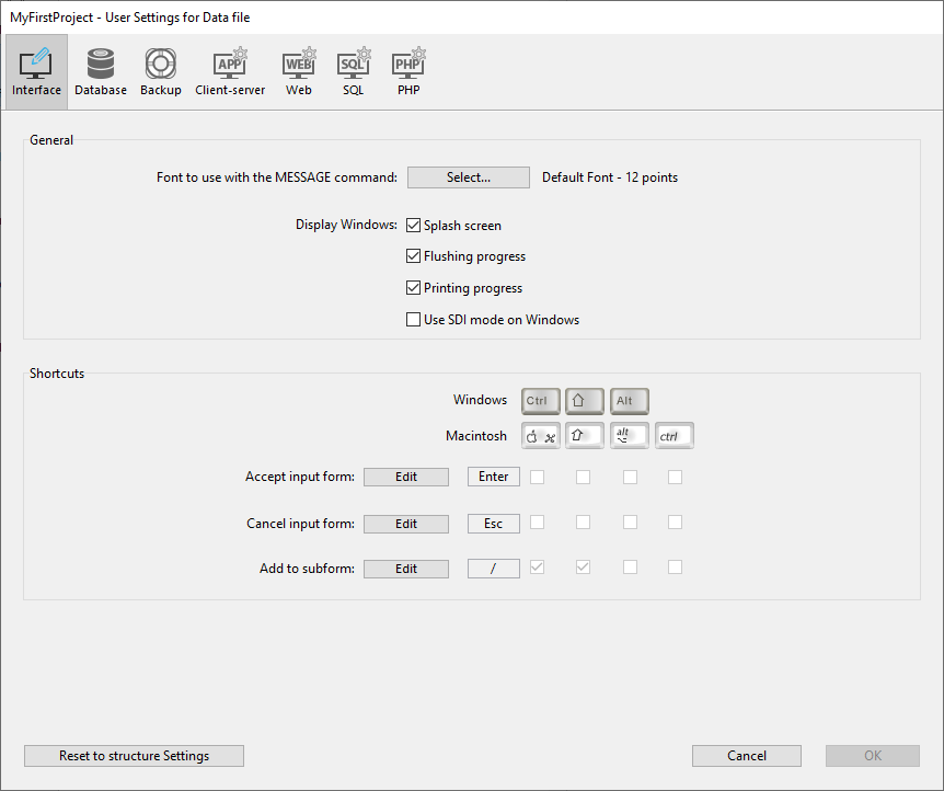 Al editar la configuración en este cuadro de diálogo, se almacenan automáticamente en el archivo settings.4DSettings correspondiente (ver más adelante).