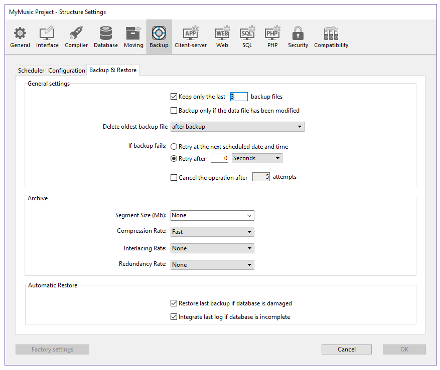• Restaurar el último backup si la base de datos está dañada: cuando esta opción está marcada, el programa inicia automáticamente la restauración del archivo de datos del último backup válido de la base, si detecta alguna anomalía (por ejemplo un archivo corrupto) durante el lanzamiento de la base. No es necesaria ninguna intervención por parte del usuario; la operación se registra en el diario del backup.