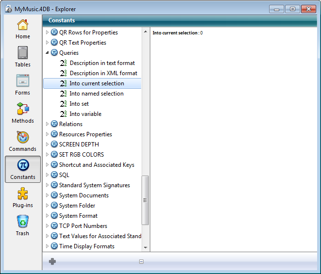 4D fornece um conjunto de constantes predefinidas. Essas constantes são agrupadas por temas na janela de Explorer: