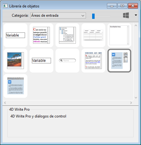 Puede crear un área 4D Write Pro preconfigurada utilizando el objeto 4D Write Pro que se encuentra en la librería de objetos (tema "Áreas de entrada"):