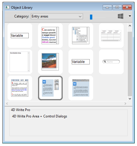 4D Write Pro documents are displayed and edited manually in a 4D form object: 4D Write Pro. This object is available as part of the last tool (Plug-in Area, Web Area, etc.) found in the object bar: