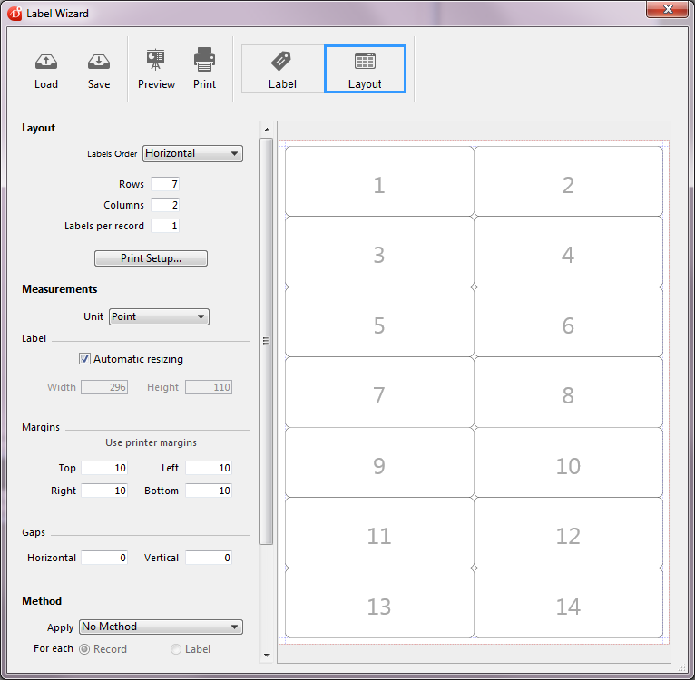 • Gaps: Estabelece a quantidade de espaço horizontal ou vertical entre as colunas e filas das etiquetas