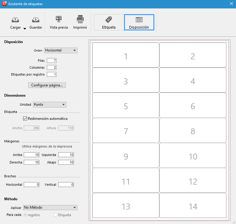 • Especificar el número de etiquetas horizontales y verticales en cada página,