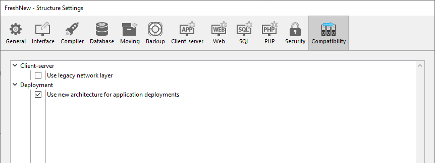 Esta opción está disponible para todas las aplicaciones a partir de 4D v15 R4. Activa o desactiva nuevos mecanismos relacionados con el despliegue de aplicaciones 4D (debe configurarse en la máquina que genera la aplicación final). Los mecanismos controlados por esta opción se describen en las secciones Último archivo de datos abierto, Gestión de archivo de datos en las aplicaciones finales y Gestión de la conexión de las aplicaciones clientes. Esta opción está desmarcada por defecto en las aplicaciones convertidas. Para beneficiarse de estos nuevos mecanismos, deberá marcarla explícitamente.