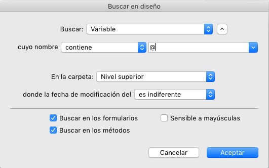 • contiene: busca la cadena entre los textos en el entorno Diseño. La búsqueda de "var" puede encontrar "mivar", "variable1" o "aVariable".
