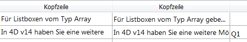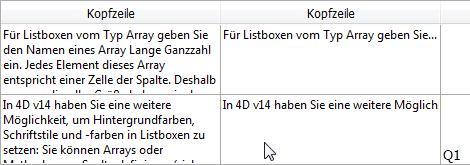 Automatische Zeilenhöhe (*): Ist diese Eigenschaft für eine Spalte markiert, berechnet 4D die Höhe jeder Zeile automatisch gemäß dem Spalteninhalt. Diese Eigenschaft lässt sich auch auf Listboxebene definieren. Ist "Automatische Zeilenhöhe" auf Listboxebene markiert, bedeutet Deaktivieren dieser Option auf Spaltenebene, dass der Spalteninhalt nicht zum Berechnen der Zeilenhöhe verwendet werden darf. Weitere Informationen dazu finden Sie im unter Automatische Zeilenhöhe im Abschnitt Eigenschaften für Listboxen).