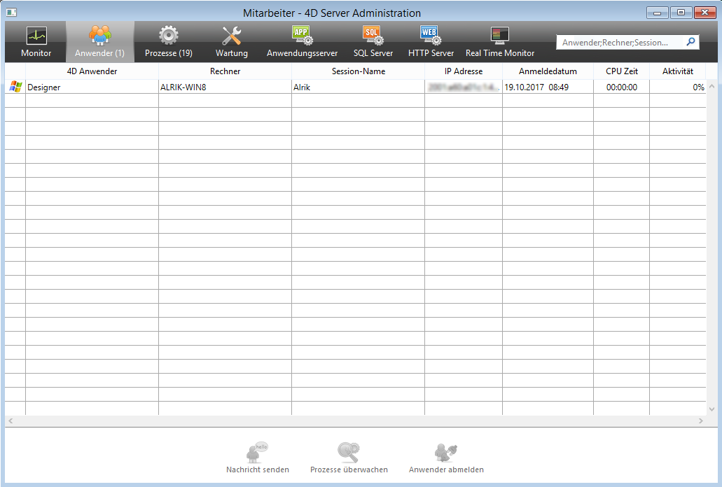 Im Verwaltungsfenster von 4D Server zeigt die Registerkarte in der Leiste am oberen Rand Anwender (1) an. Öffnen Sie die Seite, erscheinen der Anwendername und weitere Angaben.