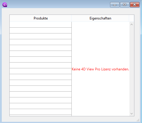4D View Pro nutzt dieselbe Lizenz wie 4D View. Ist keine Lizenz für 4D View installiert, erscheinen im laufenden Betrieb keine Inhalte eines Objekts, das ein Feature von 4D View Pro verwendet (Listbox oder 4D View Pro Bereich), sondern stattdessen eine Fehlermeldung.