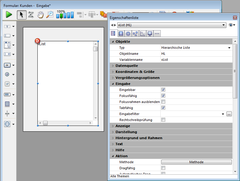 Fügt einen rollbaren Bereich hinzu, das ist eine Listbox mit einer einzelnen Spalte ohne Kopf- und Fußteile. Dieser Bereich ist standardmäßig nicht eingebbar. Sie können ihn jedoch über die Eigenschaftenliste konfigurieren.