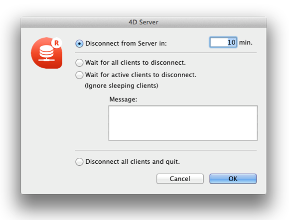 4D Serverのシャットダウンダイアログボックスにカスタムのメッセーイを入力していた場合、それぞれのクライアントマシンにはデフォルトメッセージの代わりにそれが表示されます。例: