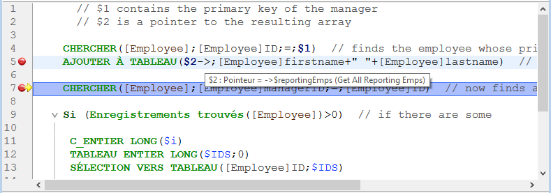 Une info-bulle apparaît lorsque le pointeur de la souris est positionné sur la variable $2, qui, d'après l'info-bulle, est un pointeur vers la variable $reportingEmps.