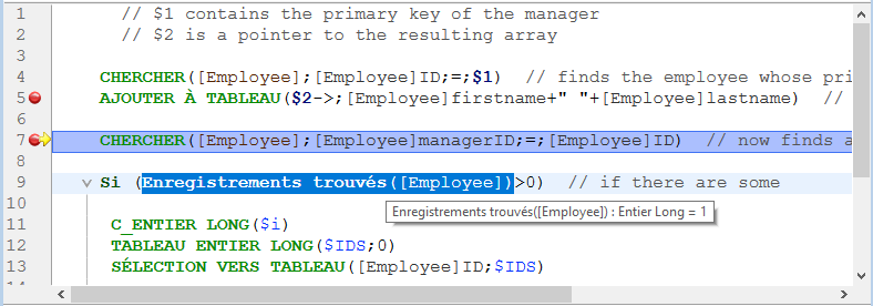 Note : Vous pouvez également définir des points d'arrêt directement dans l'éditeur de méthodes de 4D. Reportez-vous à la section Points d'arrêt.