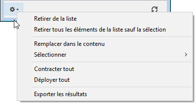 • Retirer de la liste : supprime le ou les élément(s) sélectionné(s) de la fenêtre de résultat. Cette fonction permet notamment de ne conserver que les éléments cibles d'un remplacement dans le contenu ou utilisés pour un glisser-déposer inter-applications.