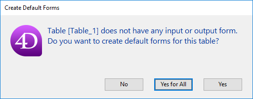 このメニューを使用して、ストラクチャーエディターでテーブルを作成した後に例えばレコードを表示するウィンドウを表示する際の、4Dの動作を設定できます。デフォルトで4Dは、新しいテーブルのフォームがまだ作成されていないことを通知し、自動でフォームを作成するかどうかの選択を促すダイアログを表示します: