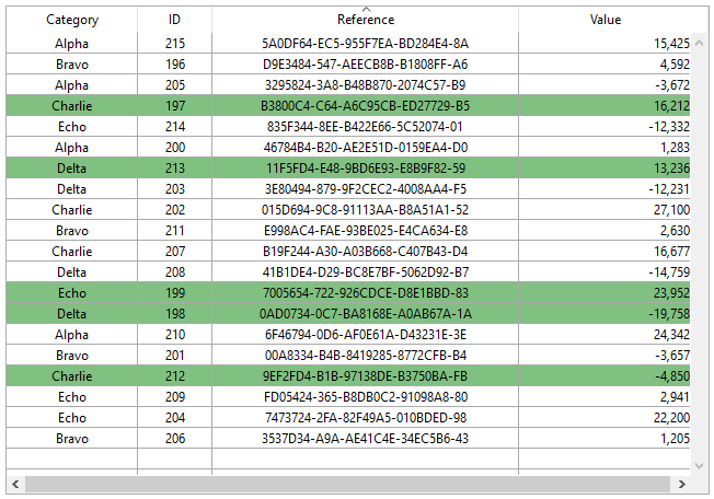 A continuación, puede definir colores de fondo específicos, colores de fuente y/o estilos de fuente por programación para personalizar la apariencia de las filas seleccionadas. Esto se puede hacer utilizando matrices o expresiones, dependiendo del tipo de list box que se muestre (consulte las siguientes secciones).