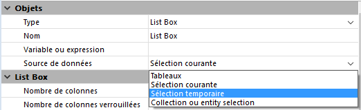 Des propriétés d'interface "masquée", "désactivée" et "sélectionnable" sont configurables pour chaque ligne de list box de type tableau.