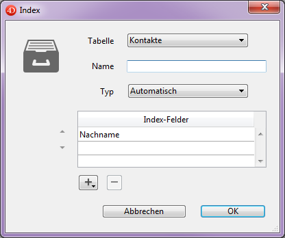 Index Felder: Hier geben Sie ein oder mehrere Felder an, die Sie dem Index zuordnen wollen. Je nach der aktuellen Auswahl im Editor kann standardmäßig schon ein Feld enthalten sein.