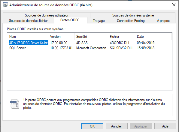 Cliquez sur l'onglet "Pilotes ODBC" pour vérifier que le pilote 4D ODBC est correctement installé :