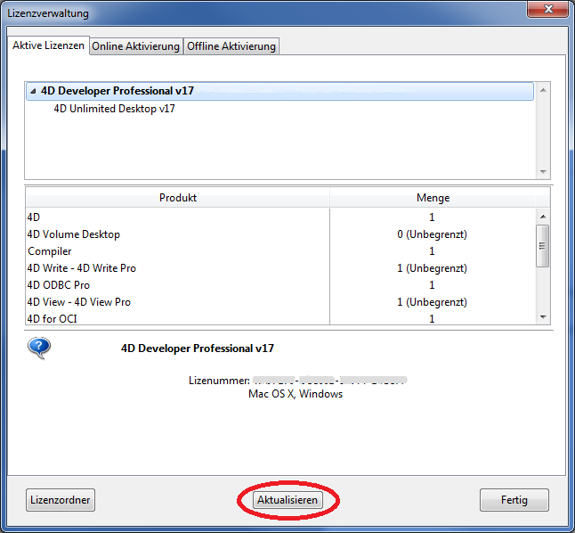 Wählen Sie im laufenden Betrieb von 4D oder 4D Server im Menü Hilfe den Befehl Lizenz aktualisieren und klicken auf die Schaltfläche Aktualisieren: