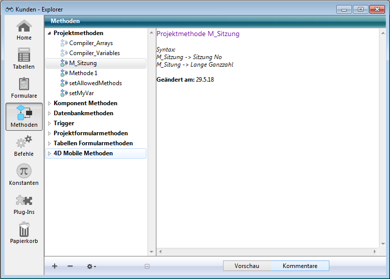 Für Methoden und Formulare der Datenbank können Sie ein automatisches Kommentarsystem aktivieren. Ist dieses System aktiv, wird jeder Methode bzw. jedem Formular, das in der Datenbank erstellt oder geändert wird, automatisch ein Kommentar zugeordnet. Das können statischer Text sein, z.B. „Geändert von“ oder Variablen, z.B. aktuelles Datum, aktueller Benutzername (wie im 4D Kennwortsystem festgelegt).