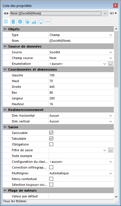 La première page (Général) affiche toutes les informations relatives à l’objet sélectionné via différents thèmes (Source de données, Saisie, Evénements, etc.). Vous pouvez déployer ou contracter chaque thème en cliquant sur l’icône de déploiement située à gauche de son nom, ce qui vous permet de n’afficher que les propriétés avec lesquelles vous souhaitez travailler. L’affichage est contextuel : seuls les thèmes et les propriétés pertinents pour le formulaire/type d’objet sélectionné sont affichés. L’affichage de certaines propriétés est également dynamiquement modifié en fonction de la valeur d’autres propriétés. Si, par exemple, vous assignez la propriété Saisissable à un champ, la propriété Tabulable s’affiche alors.