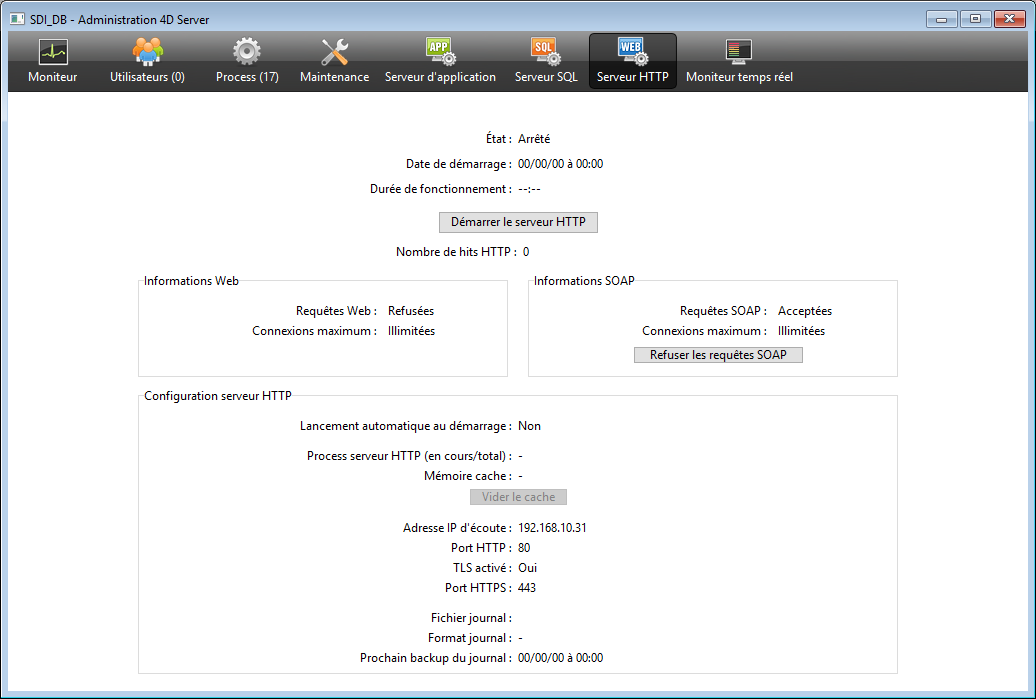 - Une fois les points précédents contrôlés et réglés, vous devez démarrer le serveur Web depuis 4D. Ce point est traité plus loin dans cette section.