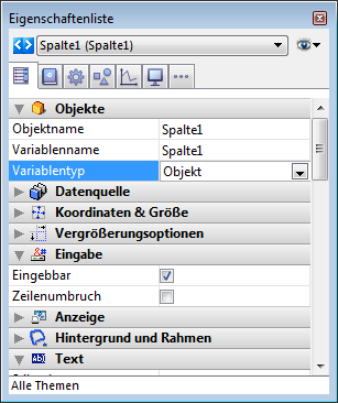 Für Spalten vom Typ Objekt können Sie keine Anzeigeformate oder Eingabefilter setzen. Sie werden automatisch gemäß dem Typ des Werts definiert. Es gibt folgende Optionen: