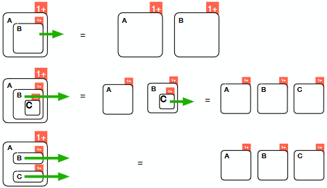 2. Cuando se hace referencia a un único objeto (A) dentro de otro objeto único (B), ambos se vuelven múltiples y comparten el mismo identificador de bloqueo. Se pueden agregar objetos individuales adicionales a (A) ya sea al costado o dentro de (B). Todos los objetos se consideran múltiples y comparten el mismo identificador de bloqueo.