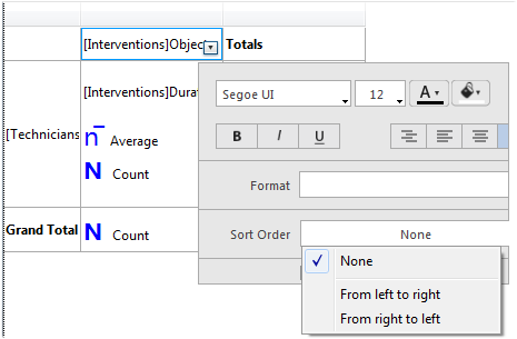 Para ordenar as categorias em um relatório em tabela cruzada, abra a janela contextual relacionada com a categoría e seleciona um valor no menu Sentido de ordem da janela pop up: