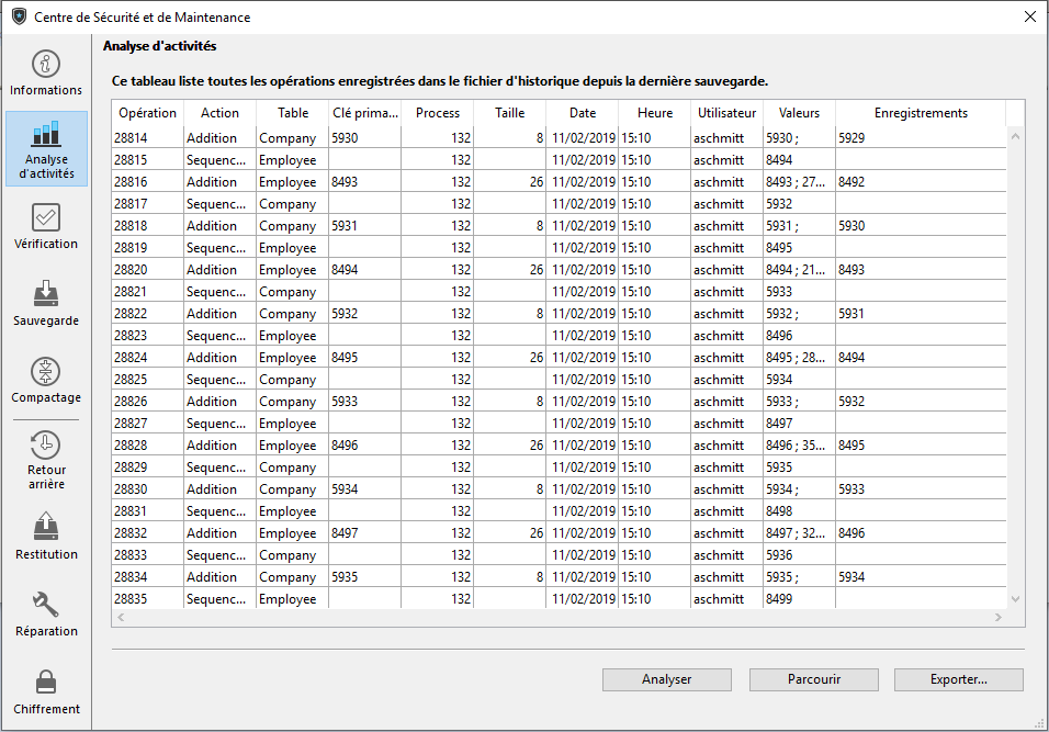 Cliquez sur le bouton Analyser pour mettre à jour le contenu du fichier d’historique courant de la base sélectionnée (nommé par défaut nomdonnées.journal). Le bouton Parcourir... vous permet de sélectionner et d’ouvrir un autre fichier d’historique de la base. Le bouton Exporter... vous permet d’exporter le contenu du fichier sous forme de texte.